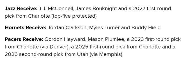 爵士得到:麦康奈尔、伯克奈特、黄蜂的2027年首轮(前5保护);