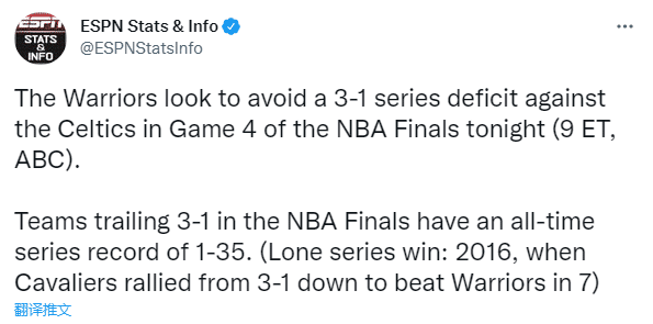 在NBA历史上,总决赛大比分1-3落后球队的系列赛战绩为1胜35负,史上唯一的翻盘逆转是2016年总决赛骑士1-3落后勇士,最终4-3逆转夺冠;换句话说,总决赛3-1领先的球队有97.2%的概率夺冠,落后一方仅剩不到3%的逆转概率。