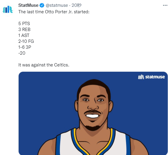 美媒Stat Muse列出波特上一次首发对阵凯尔特人时的数据,全场10投2中、三分6中1仅仅拿到5分3篮板1助攻,在场正负值-20,当时勇士22分惨败凯尔特人。