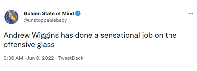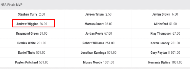 维金斯的数据,并不如库里那么抢眼,但他做出的贡献,也不容小觑。最新的FMVP赔率榜上,维金斯排在第四位,仅次于库里、塔图姆和布朗。换句话说,在勇士队内,他排在第二,被认为是勇士队总决赛表现第二好的球员。大家看好嘴哥拿下生涯第一座总冠军吗?