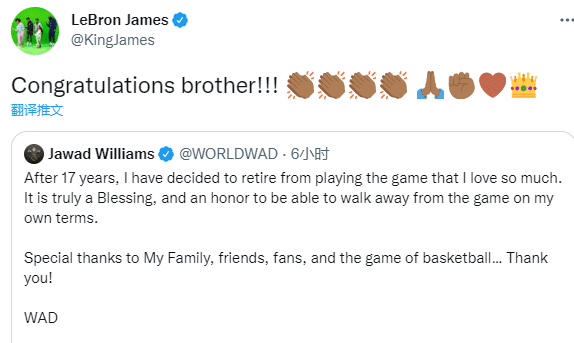来源:直播车06-01 10:46直播车06月01日讯 ,勒布朗-詹姆斯前队友贾瓦德-威廉姆斯在社交媒体上宣布正式退役,老詹本人发推祝贺:恭喜我的兄弟(4个鼓掌+拳头+爱心+王冠表情)。
