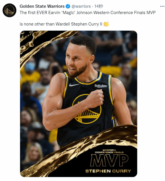 勇士夺得西部冠军并且重返总决赛,库里凭借出色的表现夺得西决MVP,这是NBA今年新增的分区决赛大奖,以湖人名宿魔术师约翰逊的名字命名;库里咧嘴大笑,全队把他抱起来庆祝,早已笑得合不拢嘴。
