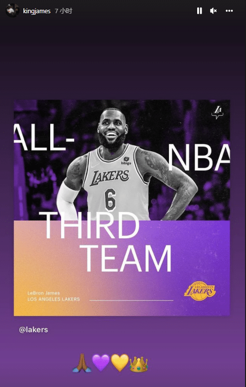 来源:直播车05-26 10:51直播车05月26日讯 湖人球星詹姆斯更新社交媒体,转发湖人官媒动态,庆祝自己入选最佳三阵;老詹先是转发湖人庆祝他入选最佳三阵的动态,配上爱心和王冠表情;湖人官方晒詹姆斯本赛季隔扣乐福、轰进三分以及大帽对手的精彩画面,并写道:史上第一位第19个赛季入选最佳阵容的球员,为国王欢呼!