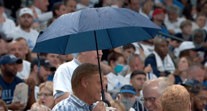 下半场开打前,独行侠球馆上方漏水,导致第三节延迟16分钟,比赛回来后,东契奇带队37-23打爆勇士,独行侠单节又投进8记三分,三节投进19记三分并且领先用锁多达29分;值得一提的是,现场有球迷打伞看比赛,如此画面太抢镜。
