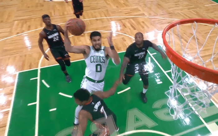 第一节,凯尔特人开局18-1,直接打懵热火。热火直到3分27秒才命中本场第一个运动战进球。首节比赛,塔图姆得到12分,怀特得到10分。而热火方面全队11分,奥拉迪波6分,巴特勒4分。这场比赛首节一度超过20分的差距,也让东决前四场每一场都出现有球队落后20分的局面。
