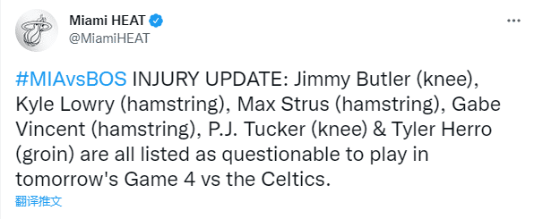 热火官方也更新了球队伤病名单,巴特勒(膝盖伤势)、洛瑞(腿筋伤势)、PJ-塔克(膝盖伤势)、希罗(腹股沟伤势)、斯特鲁斯(腿筋伤势)和文森特(腿筋伤势)都被列为出战成疑(50%出场可能)。