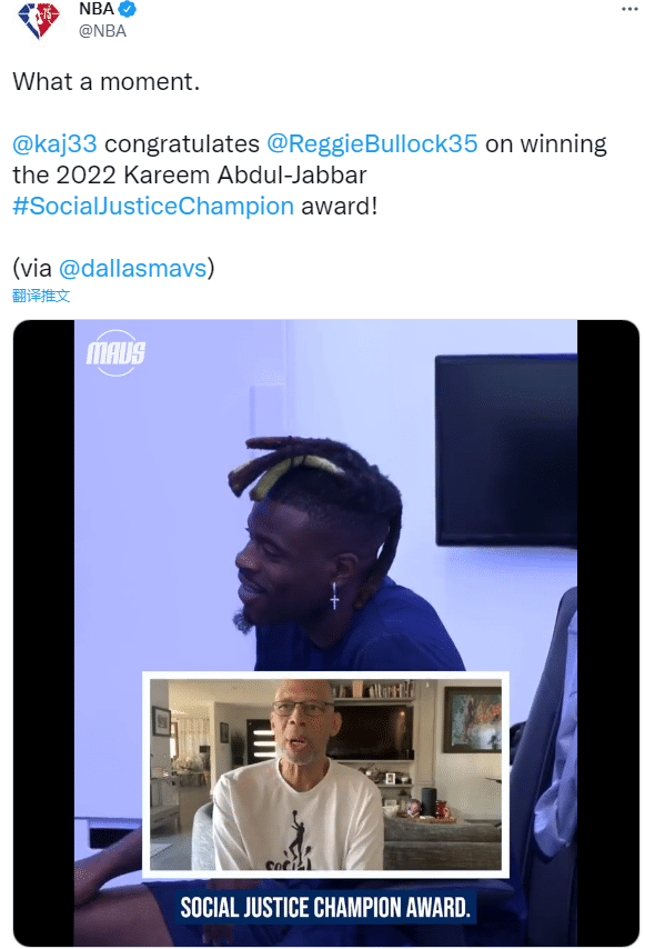NBA官宣!独行侠悍将荣获贾巴尔社会公正冠军奖,湖人官方祝贺他