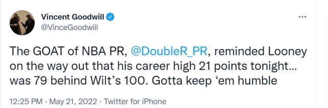 高中时期的卢尼,也曾是一个得分手。高中最后一年,卢尼的数据是27.9分12.7篮板7助攻8盖帽,当时媒体调侃这几乎是四双的表现。今天的卢尼也离不开调侃,勇士的公关部主管雷蒙-里德提醒卢尼,21分是他的生涯纪录,并且只比张伯伦的纪录少了79分。