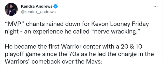 继淘汰灰熊一战拿下22个篮板后,卢尼又送出了高光表演!上一次他破了篮板纪录。而这一回他破了得分纪录。他抢下21分12篮板,不但得分创生涯新高,而且也成为了45年来第一位在季后赛得到至少20+10的勇士中锋。