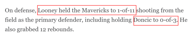 ESPN还公布了卢尼在防守端的表现。G2这场比赛,面对卢尼的对位防守时,独行侠球员只有11投1中,其中东契奇是3投0中。