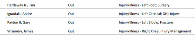 来源:直播车05-20 14:45直播车05月20日讯,NBA官方公布了西决G2的伤病报告,勇士和独行侠共有4人缺席。独行侠一方缺阵的是小哈达威,他因左脚伤势已经赛季报销。勇士一方缺阵的人员也没有变化,伊戈达拉(颈椎伤病)、小佩顿(左肘骨折)和怀斯曼(右膝伤病)将继续缺席G2的比赛。