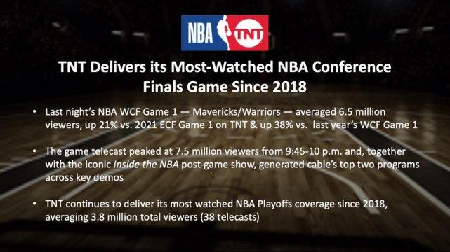 来源:直播车05-20 14:43直播车05月20日讯,TNT公布了西决首战的收视率。据报道,这场比赛的平均收视人数为650万人,比2021年的东决G1提升21%,比去年的西决G1提升38%。当地时间晚上9点45分至10点,收视人数来到最高的750万人,该场比赛与之后的《Inside the NBA》节目一起成为了当日有线电视频道中收视率最高的两档节目。