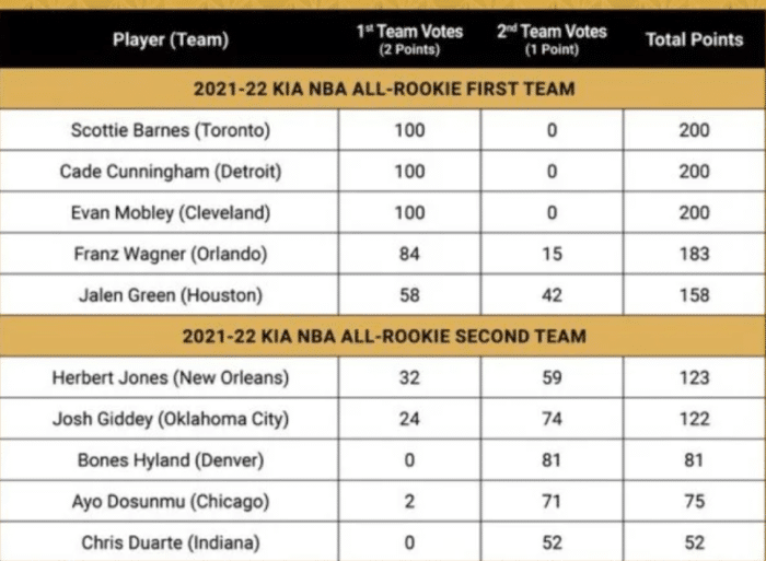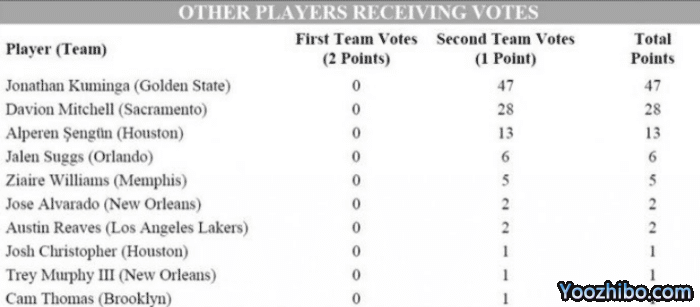 今年的最佳新秀竞争还是比较激烈,巴恩斯当选最佳新秀,他是力压莫布里和状元坎宁安。从最终的最佳新秀阵容来看,巴恩斯毫无悬念入围,他在猛龙的发挥还是非常出色,季后赛也是打出了不错的表现,只可惜出现了受伤的情况。莫布里和坎宁安也是顺利进入第一阵容,需要指出的是,三个人都是满票当选,拿到了200分,这也是对他们表现的肯定。