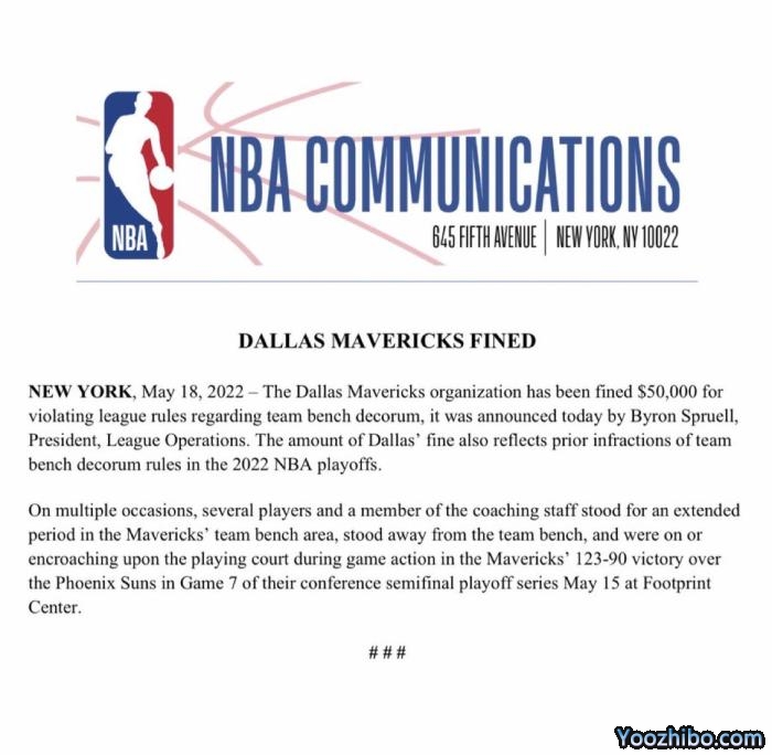 NBA官方处罚声明:在5月16日独行侠客场123-90击败太阳的比赛中,独行侠有多位替补球员和一位教练员在比赛中多次出现离开板凳席或在板凳席站立时间过久的行为,甚至侵占球场,因此违反规定而被罚款。此外,由于独行侠第二次在比赛中违反该规定,所以罚款数额上升至50000万美元。