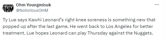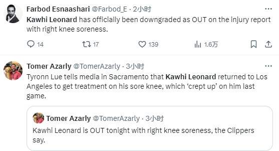 据快船队记Ohm Youngmisuk报道,泰伦-卢透露小卡因右膝酸痛将缺席今日快船与国王的比赛;卢指导透露,小卡的膝盖酸痛是上一场击败黄蜂后出现的新情况,小卡目前已经暂时离队,提前返回洛杉矶以接受更好的治疗。