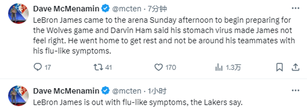 早些时候,詹姆斯因左脚踝伤势被列为出战成疑,但距离比赛开打还剩3个多小时,湖人官方宣布詹姆斯因出现类似流畅的症状而缺席与森林狼的比赛。