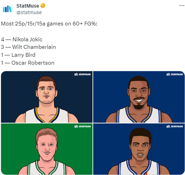 3、约基奇生涯第4次以至少60%的命中率砍至少25分15板15助,超越张伯伦(3次)排名NBA历史第一