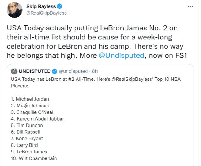 来源:直播车10-09 16:52直播车10月09日讯 ,NBA知名评论员斯基普-贝勒斯在节目上谈论《今日美国》的75大巨星排名。《今日美国》将詹姆斯排在历史第二,仅次于乔丹,而贝勒斯公布了自己心中的前十排名,詹姆斯竟然只被他放在第九。
