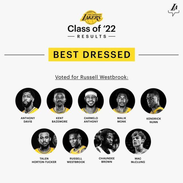 媒体日当天,湖人官方组织了一项有趣的投票活动,票选队内的10大奖项:最佳着装、鞋王、耍宝王、最佳发型、最佳能量、派对王、最佳投手、最佳扣将、最佳DJ、最乱更衣柜。此前,两个奖项已经揭晓,詹姆斯9票当选鞋王,阿里扎6票拿下最佳发型奖,如今威少以9票拿下最佳着装奖。