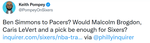 据《费城问询报》的记者报道,步行者和76人正在商讨西蒙斯的交易。该记者表示,要是76人能用西蒙斯从步行者那里换来勒维尔、布罗格登和一个首轮签,就算是相当不错的结果了。美媒认为,这样的报价,或许对于一直想用西蒙斯换来全明星+多个首轮签的76人来说,并不是最有吸引力的报价,但这已经是目前他们能拿到的最好报价了。