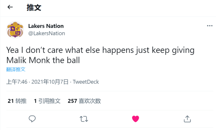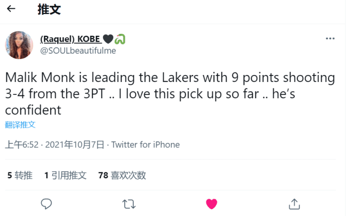 “蒙克上半场三分4中3砍下9分,得分领跑湖人,目前为止,我很爱湖人这笔引援,他太有自信了”