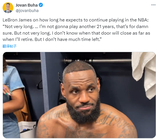 赛后谈到预计自己还能在NBA打多久时,詹姆斯表示:不会很长。我不会再打21个赛季了,这是肯定的。但不会很长。我不知道那扇门什么时候关上,也不知道我什么时候会退役,但我在NBA剩下的时间不多了。