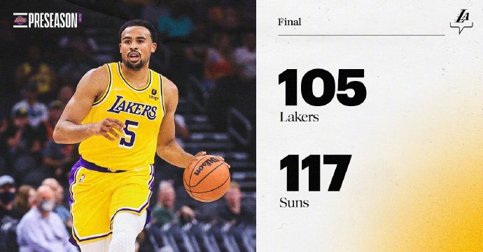 来源:直播车10-07 09:24 北京时间10月7日,2021-22赛季NBA季前赛继续进行,菲尼克斯太阳队迎战洛杉矶湖人队。最终,太阳队以117-105战胜湖人队。