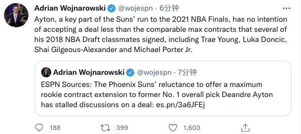 知名NBA记者Keith Smith也与几位网友就此事进行了交流,有一些球迷为太阳拒绝顶薪续约艾顿点赞并给出理由“艾顿不是顶薪级别的球员,不要责怪太阳队想要给他合适价格合同的做法。”“如果你给艾顿顶薪,那你在接下去几年就不会是一支真正有竞争力的球队。”也有人认为该顶薪续约“23岁的7尺球员,场均15+10,投篮命中率62%,同时也是一个很好的防守者,我们在搞啥?”