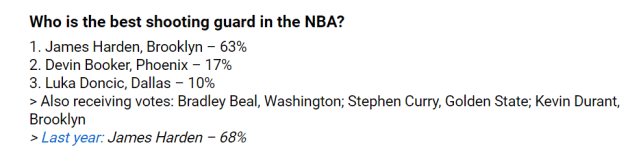 在最佳分卫的票选中,哈登得到63%的票数,高居榜首,上赛季排名第一的也是哈登,当时的得票率是68%。本赛季的票选中,排名第二的是布克(17%),第三是东契奇(10%)。比尔、库里和杜兰特都得到票数。看得出来,某些总经理投票有点随意,杜兰特和库里也出现在分卫的选择中。
