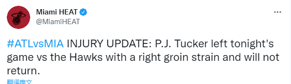 热火季前赛首战对阵老鹰,PJ-塔克首发出战,不过塔克遭遇伤病,热火官方已经宣布,塔克因右腹股沟拉伤退出比赛,本场比赛不会回归;退场前塔克出战13分钟,投篮5中2,三分3中2,贡献6分4篮板1助攻1抢断1盖帽。