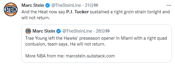 PJ-塔克伤退,老鹰球星特雷-杨也受伤退赛,特雷-杨持球组织进攻,遭遇包夹被撞到大腿,随后吹杨受伤离场,老鹰官方消息,特雷-杨伤病确诊为股四头肌挫伤,本场比赛将不会回归。下场之前,特雷-杨15投5中,拿下了15分3助攻,最终老鹰99-125不敌热火。