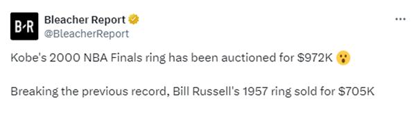 惊人!科比总冠军戒指97.2万美元售出,刷新NBA纪录