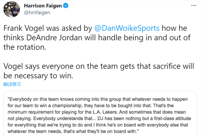 “小乔丹新赛季在一些比赛中会进入球队阵容,另一些比赛则会跌出轮换。球队里的每个人都清楚,无论球队有什么样的安排,只要是为了总冠军,他们都会接受,这也是为湖人打球的最低要求。有些时候,这代表着你无法出战某些比赛。”沃格尔说道。