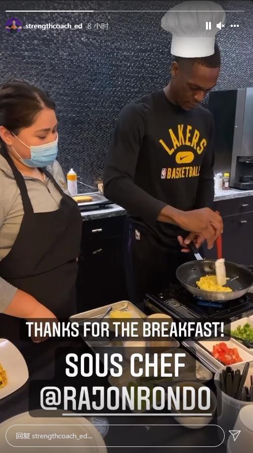湖人助教Ed Streit在社媒晒出了一则动态:隆多在亲手为训练馆的队友、教练们做早餐。看起来冷酷的隆多也有很暖的一面,戴上厨师帽看起来好像是在煎鸡蛋,表情也是相当认真!隆多新赛季可能不会每场打很久时间,主要担任更衣室领袖,这是准备兼职照顾队友生活了?