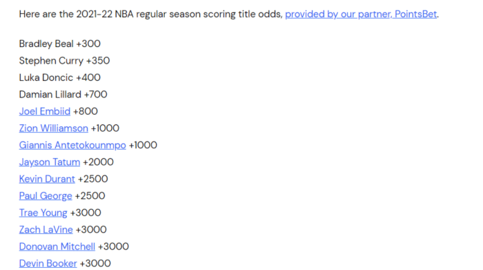 来源:直播车09-08 19:28直播车9月08日讯新赛季关于总冠军的归属,关于常规赛MVP的归属,都是人们讨论和关注的话题。当然得分王也是大家所为之关注的焦点,那么最新一个赛季,哪名球员最被看好成为得分王呢?新赛季得分王赔率最新出炉,排名第一的是来自奇才的比尔,力压NBA众多球员排在这一榜单第一名,赔率为+300。