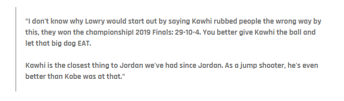 直播车9月07日讯几天前,热火球员洛瑞参加一档播客节目,谈到了猛龙夺冠那个赛季的一些细节,对于伦纳德,洛瑞表示:“他的一些做法惹恼了队友,他会对别人说‘把球给我,我会把事情办好’。”当然,洛瑞他自己承认,虽然数据方面有所下降,但是球队最终捧起总冠军奖杯,伦纳德起到了决定性作用。日前,美名嘴斯基普贝勒斯在自己最新一档节目中强调:伦纳德是乔丹之后,NBA这几十年时间里最接近乔丹的球员,作为一名投手,他甚至比科比还要出色!