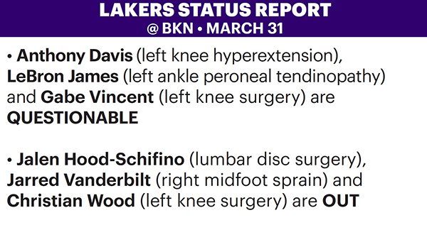 来源:直播车03-31 16:01直播车讯 北京时间3月31日,湖人官方正式公布下一场对阵篮网的伤情报告,詹姆斯和浓眉都因伤出战成疑,文森特迎来复出利好,连续伤停46场后终于被列为可能出战。