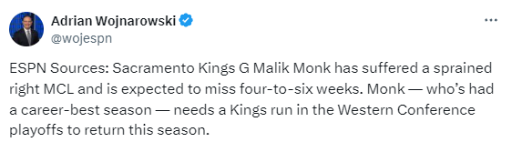来源:直播车03-31 15:53直播车讯 北京时间3月31日,国王又遭重创,据名记woj报道,国王队后卫蒙克遭遇右膝内侧副韧带扭伤的伤病,预计缺席4-6周,本赛季是蒙克职业生涯中个人表现最好的赛季,这样也将意味着本赛季接下来需要国王成功闯进季后赛,蒙克才有机会在本赛季回归。