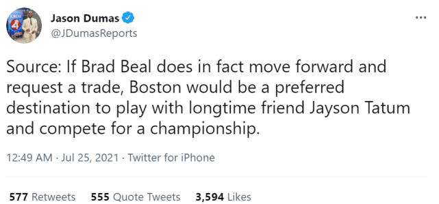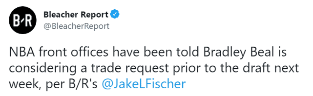 来源:直播车07-25 10:38直播车讯 北京时间7月25日,据Bleacher Report(B/R)记者Jake Fischer报道,奇才球星布拉德利-比尔考虑在选秀大会前申请交易,而B/R的另一位记者Jason Dumas爆料称,如果比尔决定申请交易,他的首选下家将是凯尔特人。