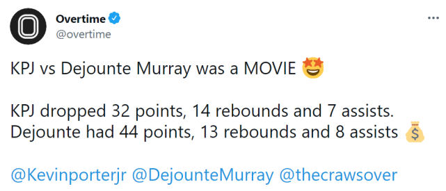 来源:直播车07-25 10:22直播车讯 北京时间7月25日,火箭队21岁新星小凯文-波特参加西雅图The Crawsover联赛,单场轰下32分14篮板7助攻,他和马刺后卫德章泰-穆雷多次对位,展现了全面的进攻能力。穆雷也在这场比赛中得到44分13篮板8助攻。两人来自同一所西雅图高中,是多年的好友。美媒Overtime感慨两人的对决就如同一部电影。最终,小波特所在的球队112-99获胜。
