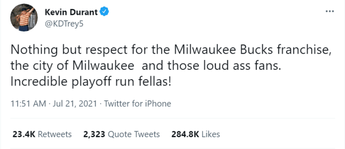 雄鹿夺冠后,杜兰特也第一时间在社媒上向这支球队致敬。他写道:“对雄鹿、这座城市以及他们的球迷只有敬意,难以置信的季后赛旅程!”
