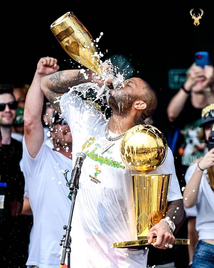 塔克喝到狂喷香槟!字母哥亲自送上总冠军奖杯,他的表情就像喝醉了