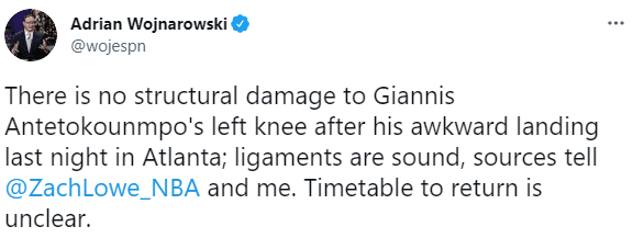 字母哥检查结果出炉!左膝无结构性损伤+韧带完好,暂无复出时间表
