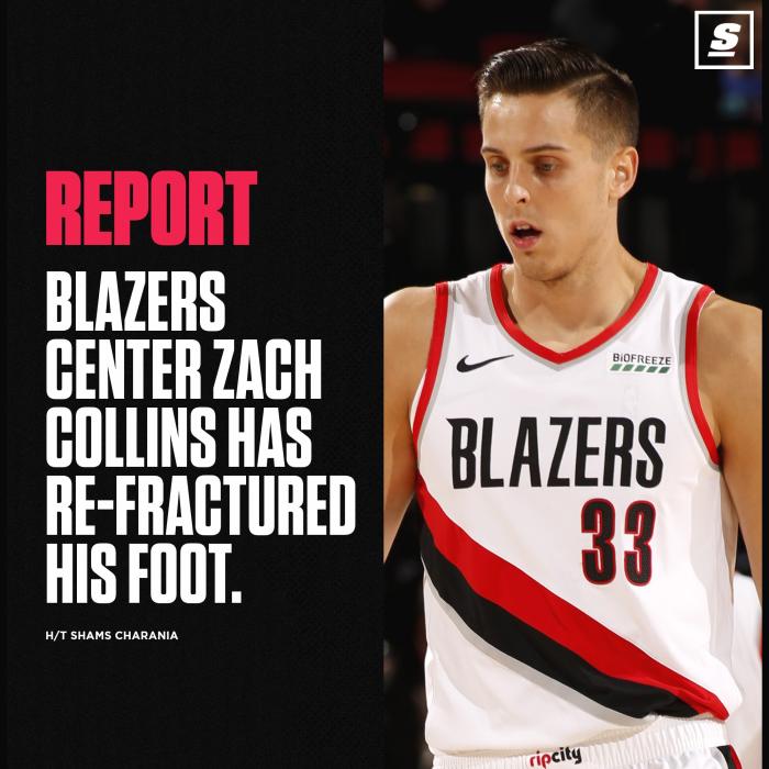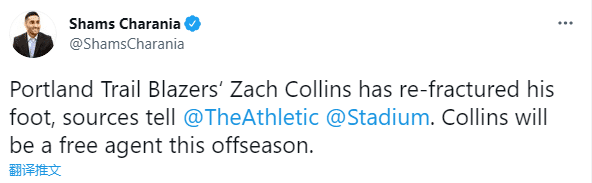 来源:直播车06-30 14:50直播车讯 北京时间6月30日,据名记shams报道,开拓者中锋扎克-科林斯再次遭遇脚部骨折,而今年休赛期,他的合同到期将成为自由球员;科林斯接连遭遇骨折,这伤病将影响他的新合同,年仅23岁却沦为玻璃人。