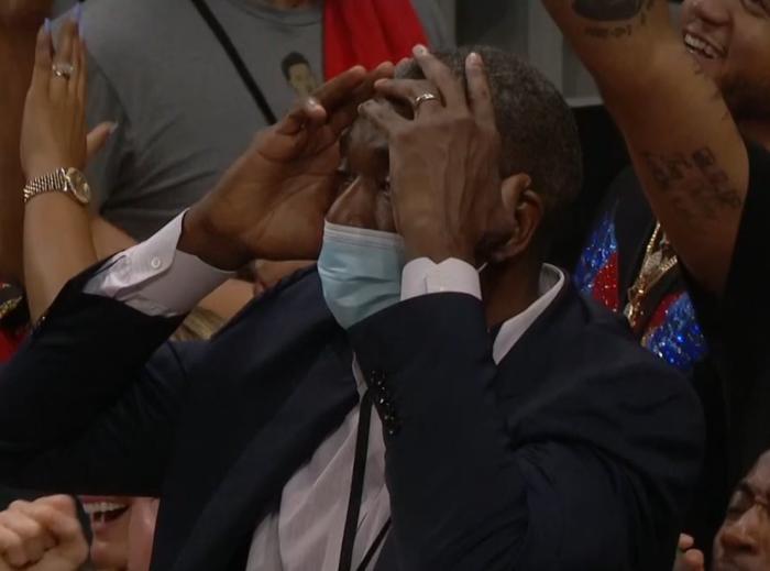 卡佩拉神仙球点燃全场,坐在场边观战的特雷-杨兴奋地疯狂怒吼庆祝,老鹰名宿穆托姆博则是双手抱头,一脸不敢相信的样子。