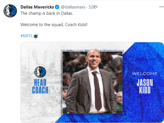来源:直播车06-29 15:38直播车讯 北京时间6月29日,达拉斯独行侠正式官宣,杰森=基德正式成为独行侠队史第十任主教练,独行侠官方发推写道:那个总冠军重返达拉斯,欢迎来到球队,基德教练;独行侠还在今天正式任命尼科-哈里森成为球队新任总经理。
