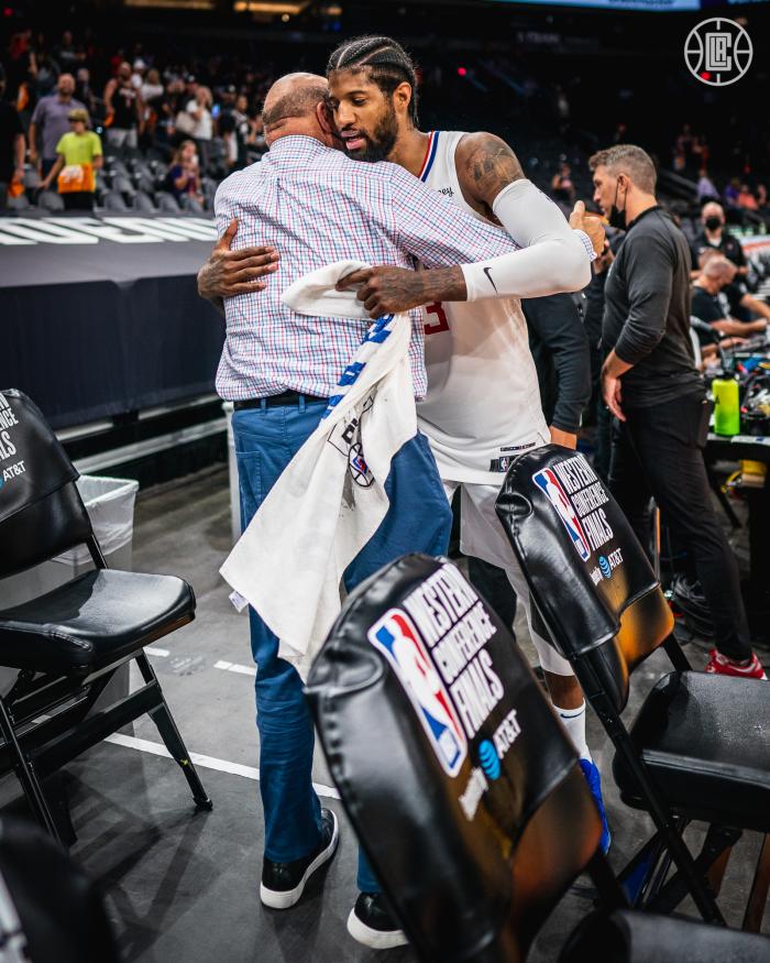 乔治下半场统治比赛,末节惨遭克劳德戳眼恶犯,但这仍旧防不住乔治;比赛还剩1分多钟,乔治提前下场,坐在替补席一脸淡定,并没有大笑庆祝,因为他知道快船距离总决赛还有很长的路要走,现在还不是庆祝的时候。不过赢球后,乔治拥抱了老板鲍尔默。
