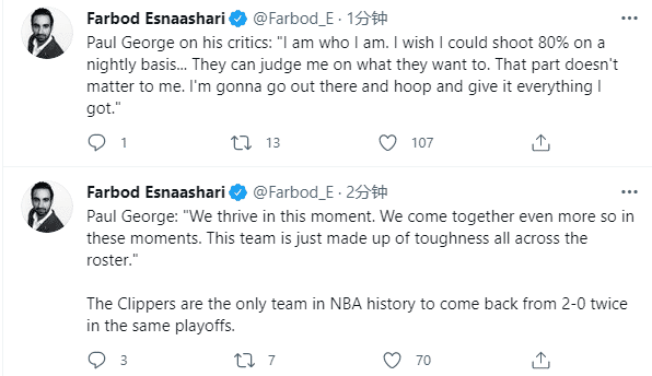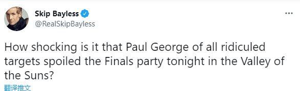 1-3生死战快船又赢了,没有小卡也没有祖巴茨,乔治单核带队拿下胜利,赛后名嘴贝勒斯被打服了,他发推写道:乔治亲手毁掉了太阳的总决赛庆祝派对。