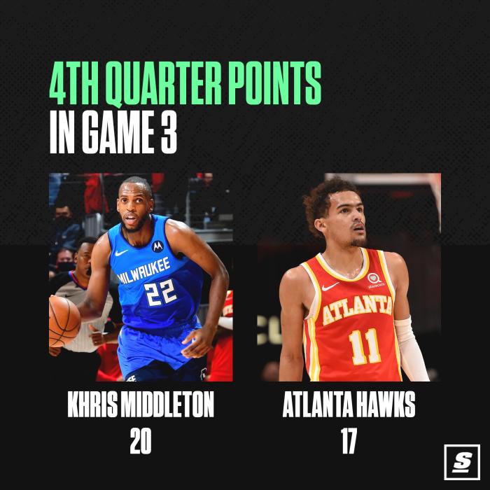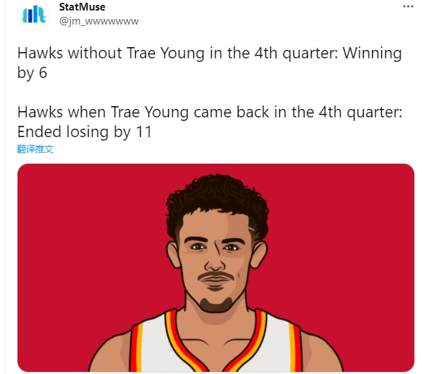 末节特雷-杨仅仅投进一球贡献3分,老鹰全队第四节只有17分,而雄鹿二当家米德尔顿末节独砍20分,一个人得分超老鹰全队;老鹰末节崩盘,杨受伤后在场上几乎就是一个累赘——据统计,末节杨不在场时,老鹰赢雄鹿6分,杨带伤出战后老鹰最终输给雄鹿11分。
