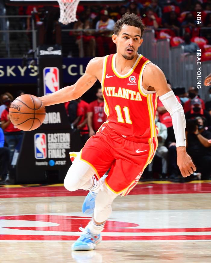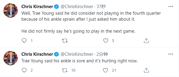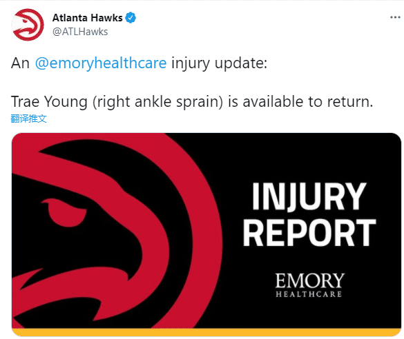 老鹰官方宣布特雷-杨右脚踝扭伤,带伤继续出战。